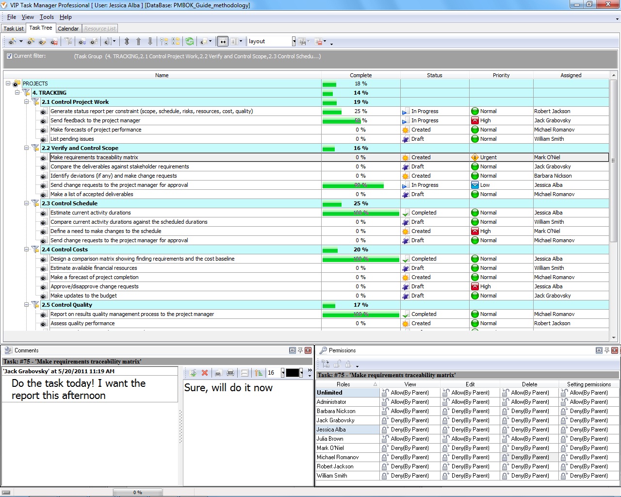 Please look at the screenshot to see the tasks listed in Task Tree view of VIP Task Manager. By using Permissions panel you can allow members of your project team to share the tasks. The project manager can monitor status of the tasks and exchange comments with the team.