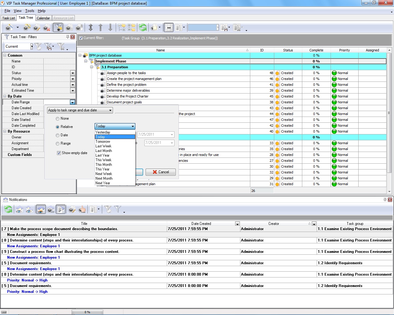As it has been told, both processes of the Implement phase are convenient to turn into sets of simple tasks planned and managed with help of VIP Task Manager. Your expert team can use Task Tree view of the software to create a hierarchy of tasks relating to the processes. Below you can see an example of such tasks organized into categories.