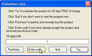 3. If your trial period has not been expired yet, "Evaluation copy" window will appear. Click on "Enter code…" button in this dialog.