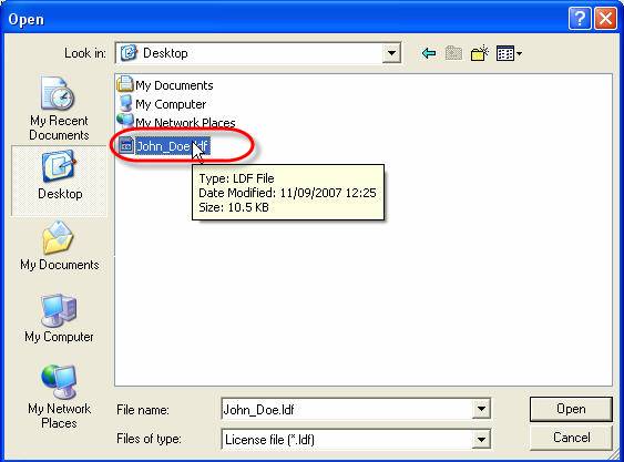 6. In "Open" dialog find and select the ".ldf" code (ex.: John_Doe.ldf on Desktop)