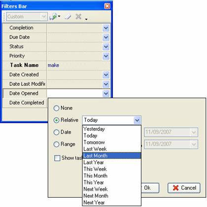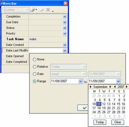 "Filter by Date Created", "Filter by Date Last Modified", "Filter by Date Opened" and "Filter by Date Completed", allow you to filter tasks by the date when they were created, last modified, opened and completed correspondingly in relation to required date and time or time interval. |
