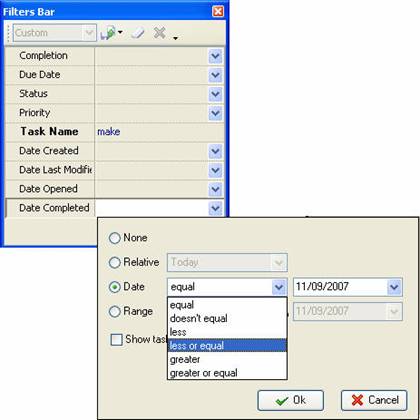 "Filter by Due Date" allows you filter the tasks by their due date in relation to required time and date or time interval.