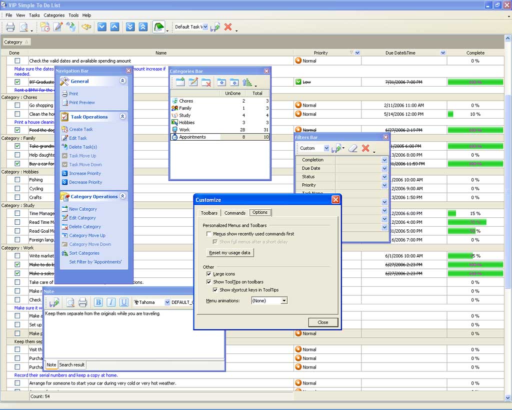 The program features easy and intuitive interface which can be set in different styles including Windows XP native style. Customizable toolbars, task list grid and floating panels allow you to make it convenient for your particular needs.