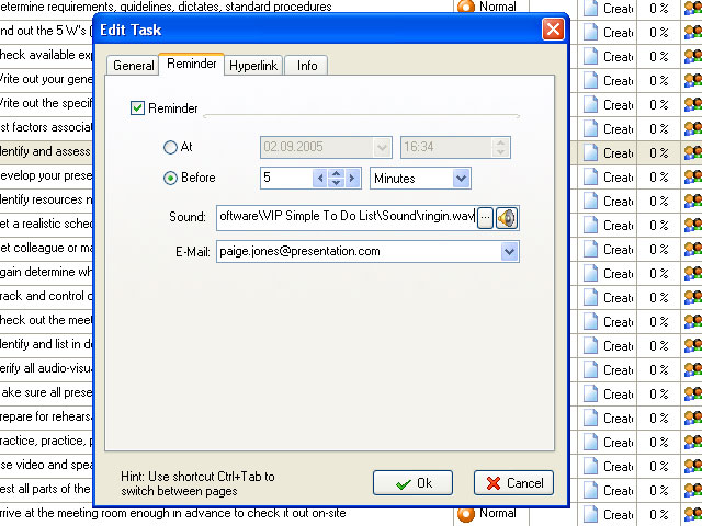You can set To Do List reminders in the form of message, melody, or send an e-mail with task reminder to computer or mobile phone. Reminder can be set both for definite time and for some period before that time.