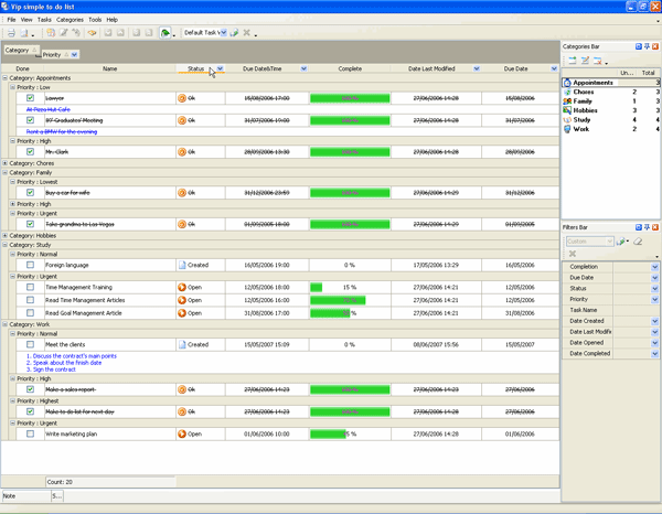 Categories bar - by default is located in the upper right part of the application window and displays a hierarchical list of existing categories, allowing to quickly filter the tasks by category.