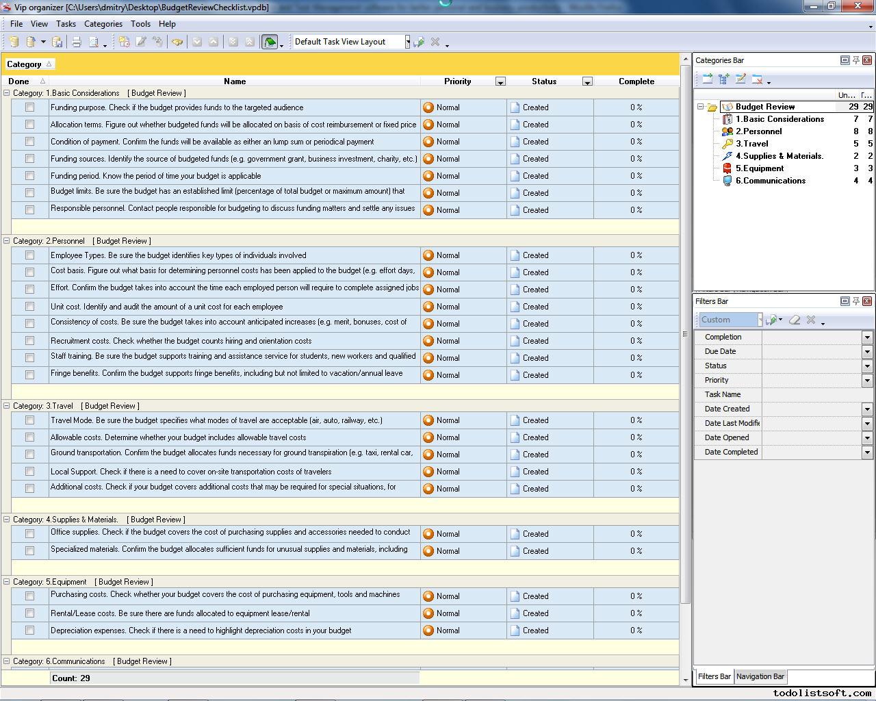 Read this Budget Review Checklist to find out how to evaluate corporate budgets. The checklist highlights the key items to be reviewed and evaluated, including Personnel, Travel, Supply & Materials, and others. It is best used with VIP Organizer software.