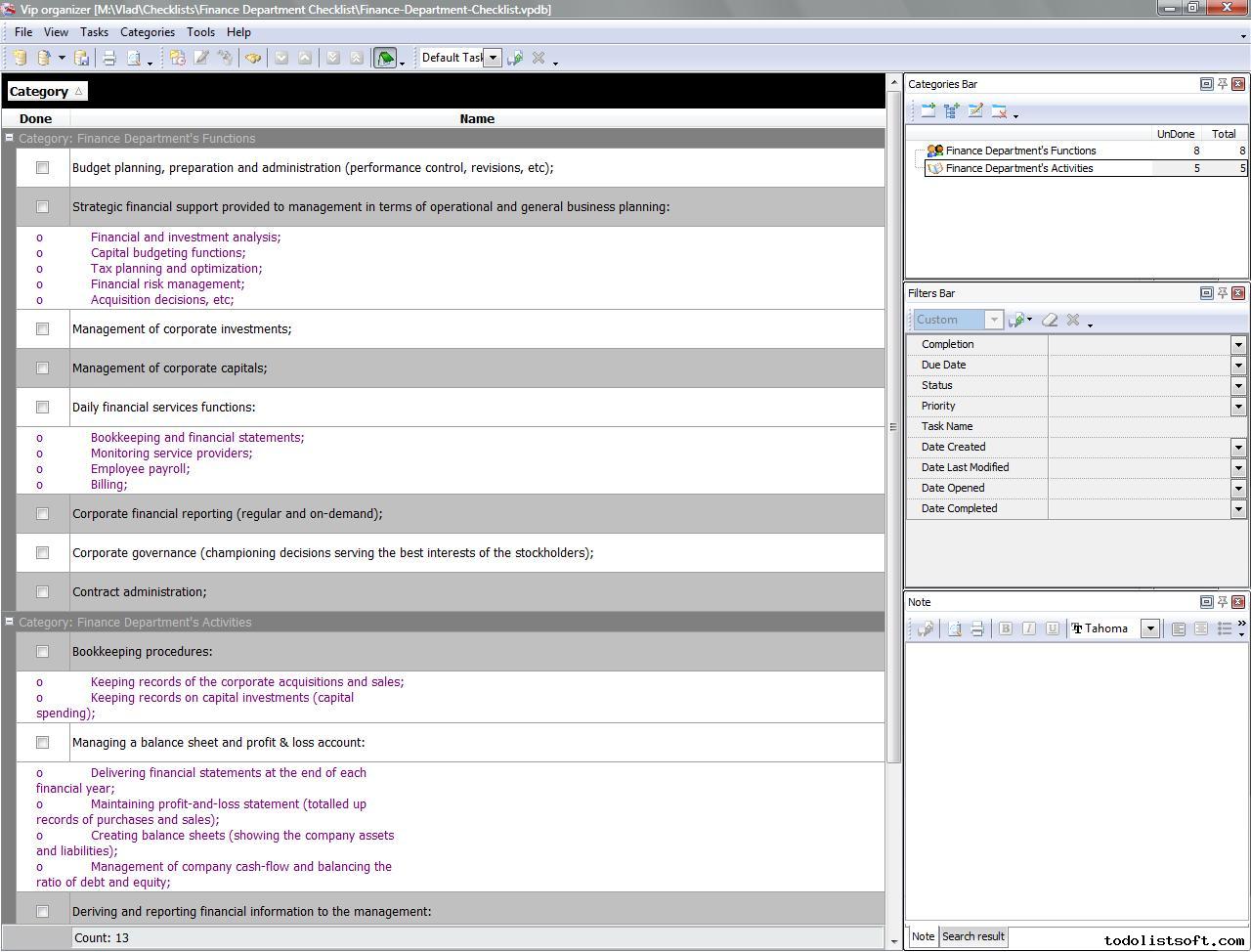 Finance Department Checklist is composed for the business administrators who want to establish appropriate departments in their companies. In this checklist you can find a list of specific functions and activities that are peculiar to financial departments (the financial and accounting affairs).