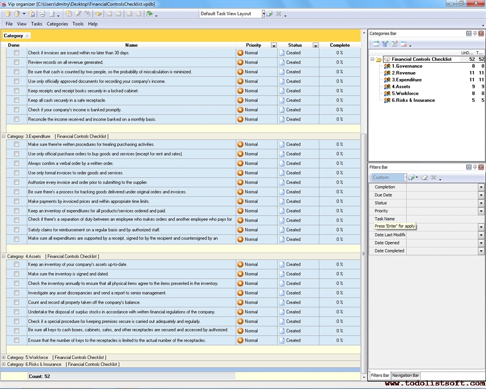This Financial Controls Checklist includes a range of tasks you can do to check if your business organization is financially stable. Its content covers such economic aspects as governance, revenue, expenditure, assets, workforce, and risks & insurance.