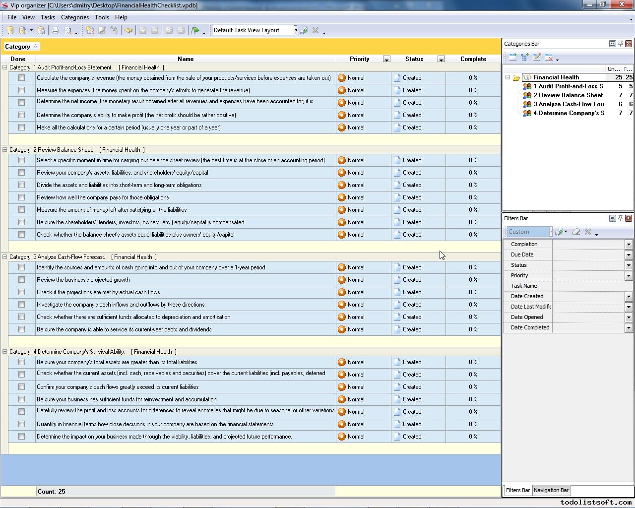 The goal of this Financial Health Checklist is to enable a business organization to perform an assessment about its financial well-being. It provides general guidelines to measuring your company’s financial health. It is recommended to use the checklist in combination with other business review plans and financial analysis.