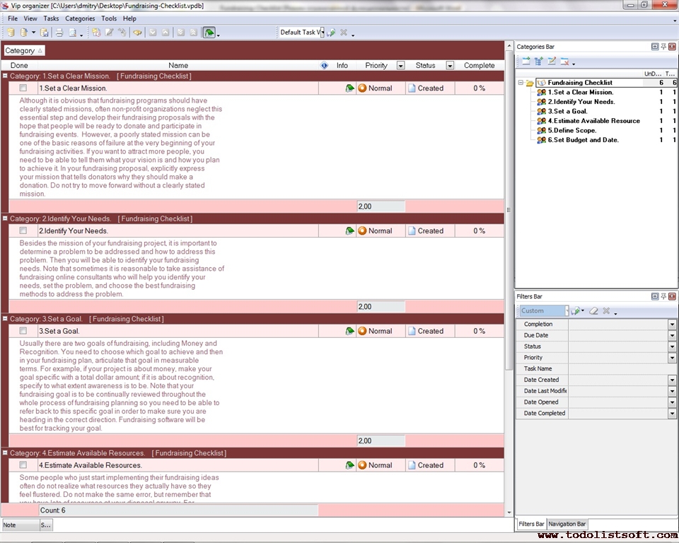 This Fundraising Checklist will help you make sure whether you have everything you need to organize a successful fundraising project. The checklist includes a set of fundraising tips and ideas to set a clear mission and goal for your project and to estimate available resources.