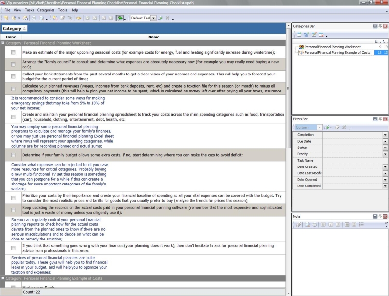 This Personal Financial Planning Checklist will be helpful to anyone who wishes to be successful with planning his/her family financial welfare, because this checklist outlines the personal financial planning process that can be followed to reach more controllability with money you earn and spend. This Personal Financial Planning Checklist gives you some examples of expenses (categories that money can be spent over).
