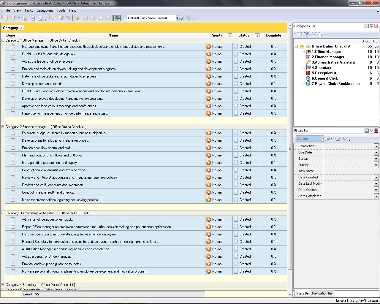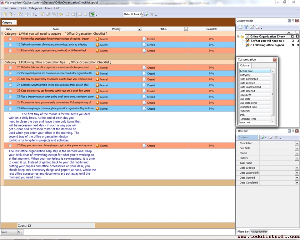 It is important to develop and implement an office organization strategy that helps re-organize your workplace at the office of your company. The given below office organization checklist is designed to show how your office workplace can be organized in order to maximize your productivity and reduce an amount of time wasting.