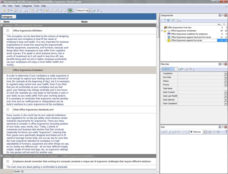 This Office Ergonomics checklist can be helpful both to employees and managers in order to study what the Ergonomics is, and what it is all about. You will know why the office ergonomics benefits are really worth of investments for business managers as far as establishing a serious attitude to this discipline will bring much more profits in prospective terms. This office ergonomics checklist will help you to learn some facts and useful recommendations;