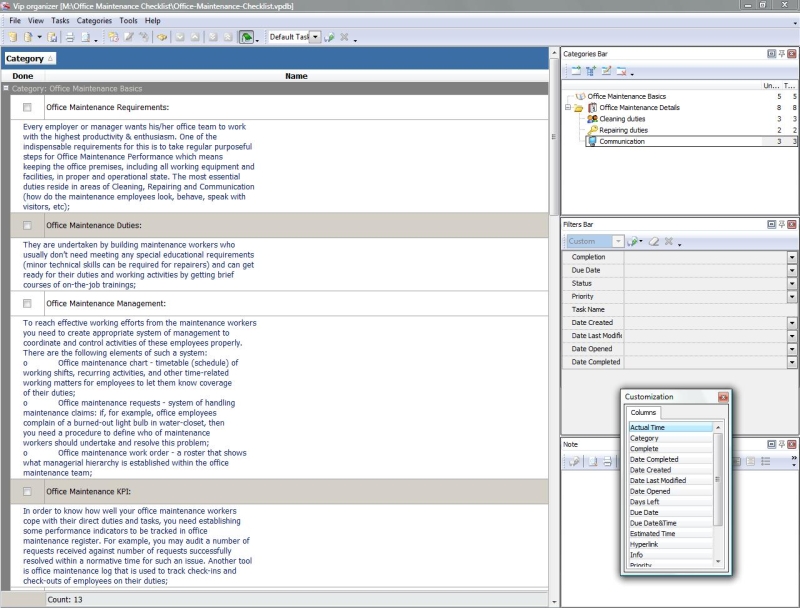 This Office Maintenance Checklist explains you how you can reach and maintain a proper state of your office premises to let your employees get more pleasure from working there. With a help of this Office Maintenance Checklist you will study the working duties for your office maintenance workers, including tools & KPIs that can be used for controlling, coordinating and measuring their activities.