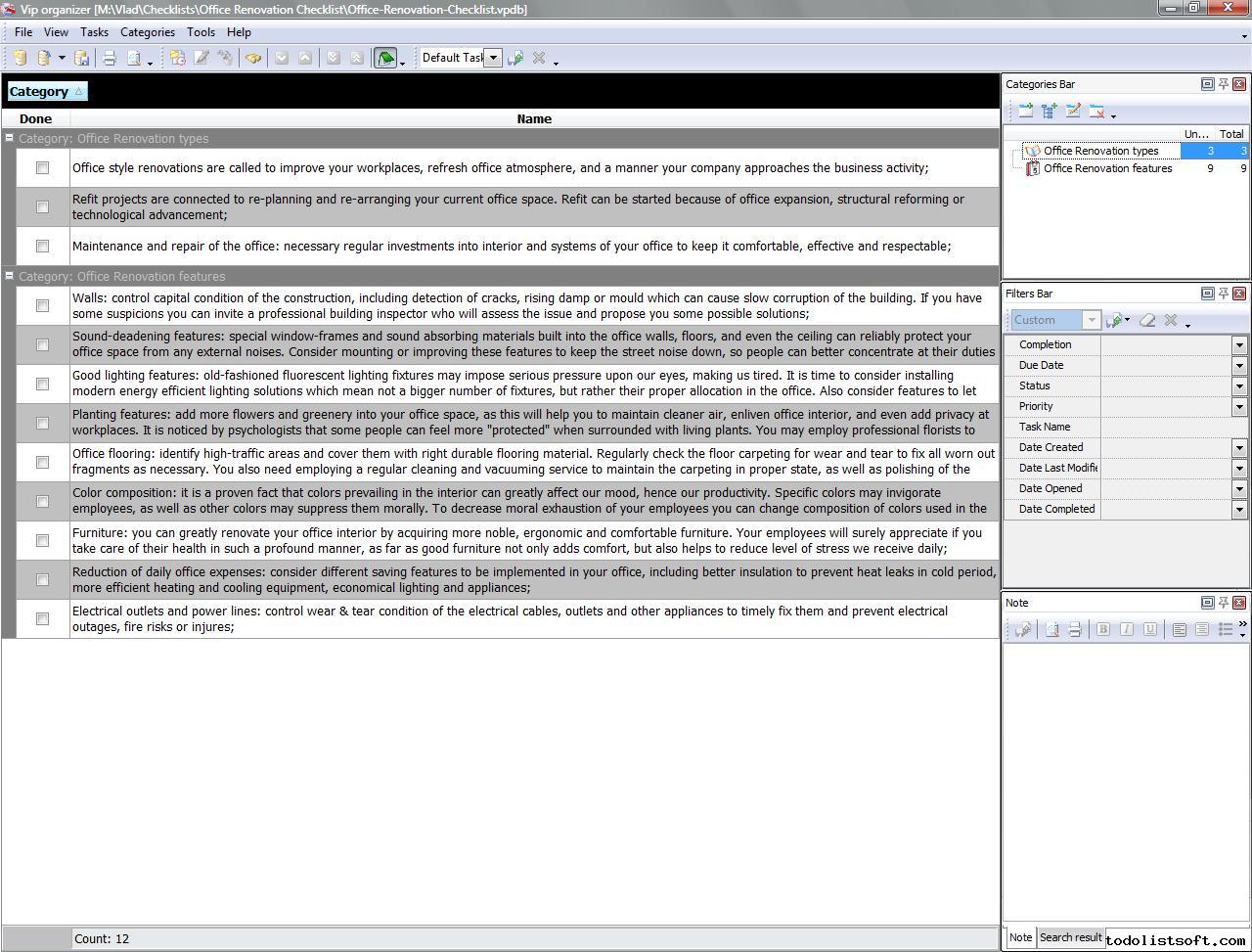 Office Renovation Checklist is composed for all office managers and business owners who seek ideas for whether increasing comfort level or improving functionality of their supervised offices. In this checklist you will find a list of possible office improvements (office renovation ideas).