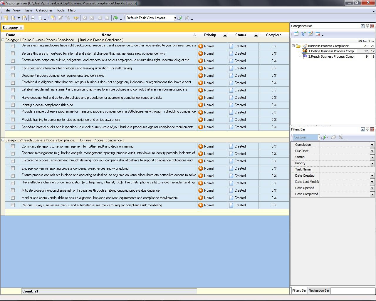 Because most business environments are influenced by uncertainty, various companies have to plan for process compliance in order to ensure business integrity and profitability. Read this Business Process Compliance Checklist to find out how to define and ensure compliance of business processes in your company. Business Process Compliance Checklist