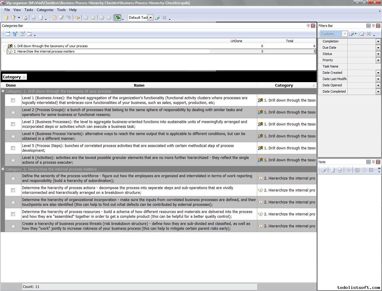 Business Process Hierarchy Checklist is created for business managers who would like to define taxonomy of their processes within organizational structure, as well as to hierarchize their internal process matters, such as workforce, resources, etc. Business Process Hierarchy Checklist