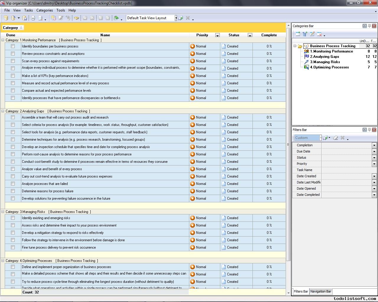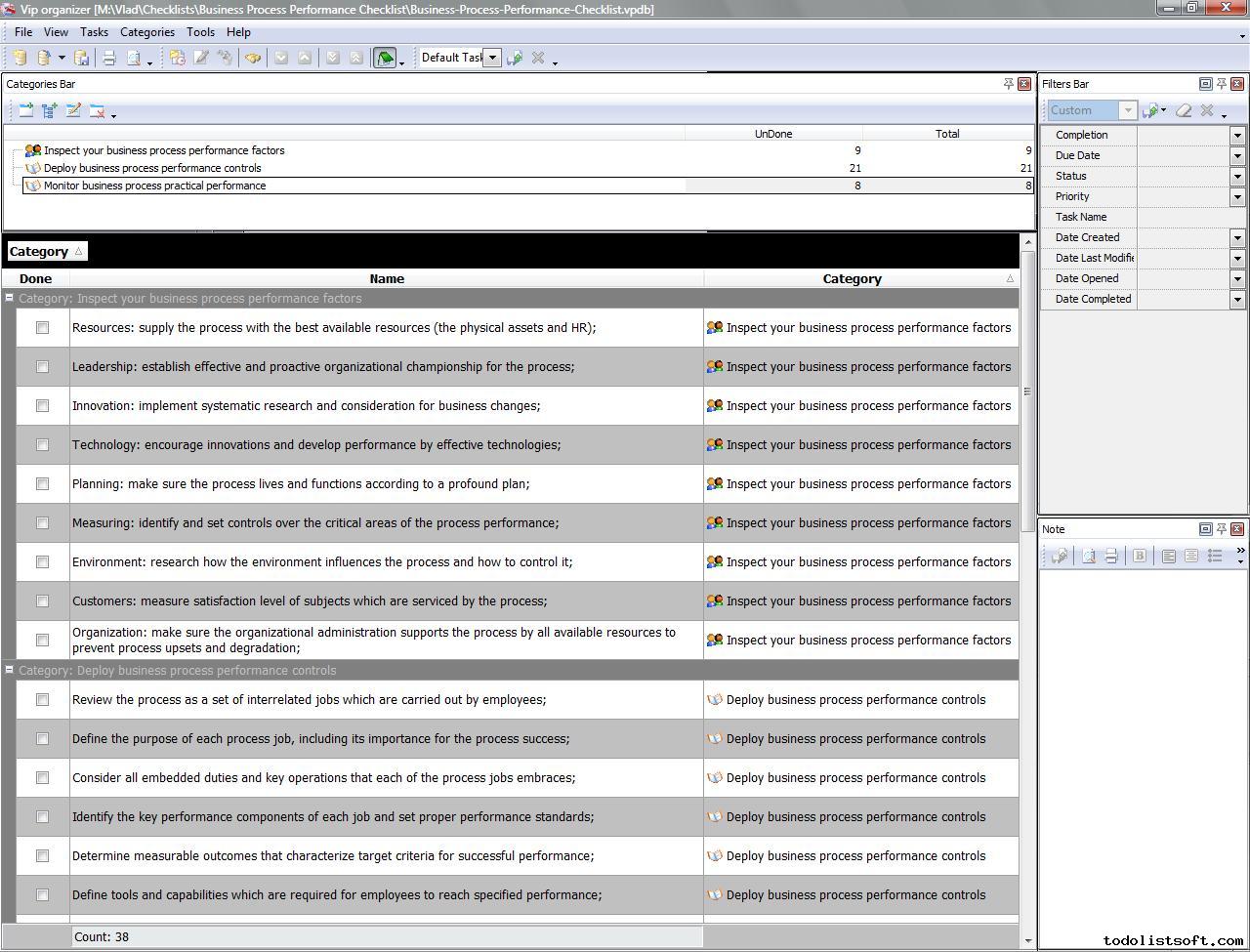 Process tracking is an activity that aims to monitor process performance, analyze gaps, respond to risks, and reach optimization. This activity is described in this Business Process Tracking Checklist. The checklist explores key steps of the activity. Business Process Tracking Checklist
