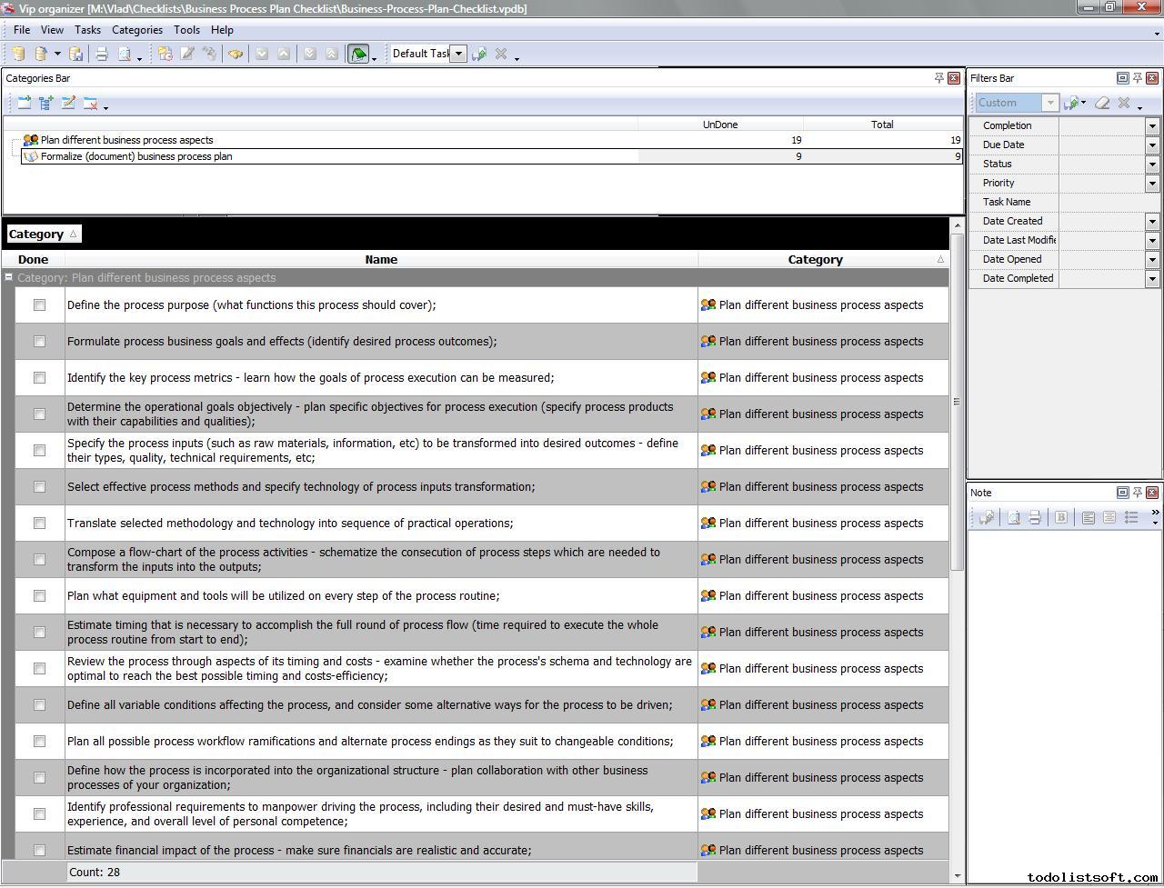 Business Process Plan Checklist is created for enterprise managers who wish to elaborate how their processes will be organized and carried out in practice. With a help of this checklist you can define elements of the process, including workforce, tangible and organizational assets, their co-operation and mutual use.   Business Process Plan Checklist