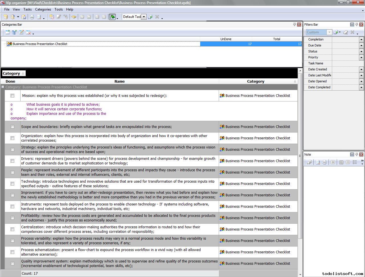 Business Process Presentation Checklist will helpful to those who wish to create a presentation of a process, whether a newly established or after it has been redesigned. With a help of this checklist you can document your process mission, strategy, drivers, and many other aspects. Business Process Presentation Checklist