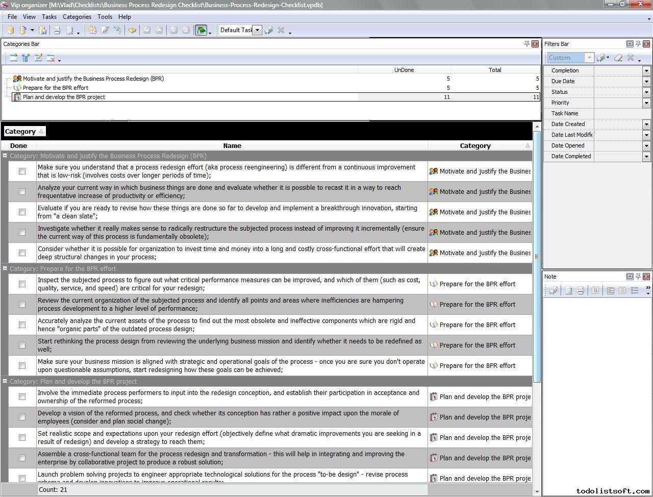 Business Process Redesign Checklist is created for business managers who wish to accomplish a reengineering project to dramatically change some of their processes to increase their yield. By help of this checklist you can justify, prepare and develop your business process redesign. Business Process Redesign Checklist