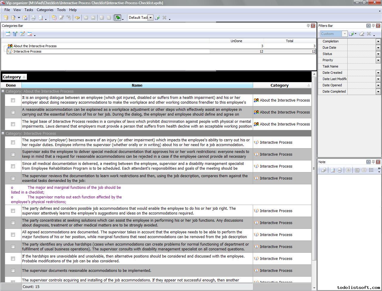 This Interactive Process Checklist will be helpful both to employees and employers to know their duties and rights in terms of Interactive Process which is the term meaning a dialog between an employee who suffers from a health impairment and his or her employer who considers reasonable accommodations to facilitate further labour of this person. Interactive Process Checklist