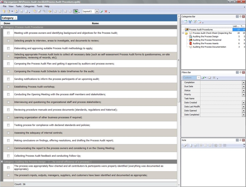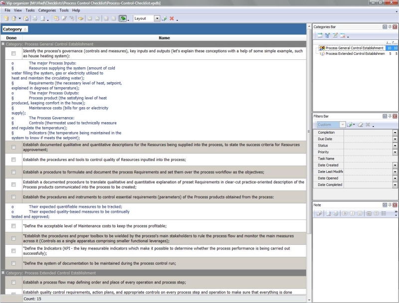This Process Control Checklist is created to assist business executives who need to set up controls over their organizational and production processes in order to ensure their quality. With a help of this Checklist you will understand what should be added into unique processes of your organization in order to make them steadily productive and controllable. Process Control Checklist