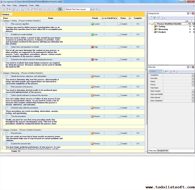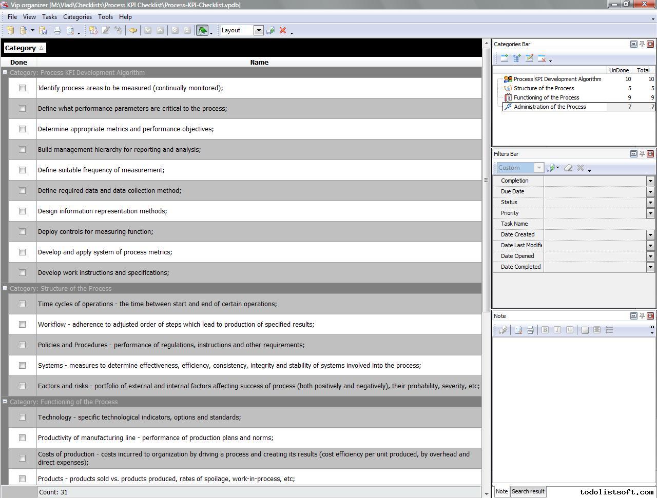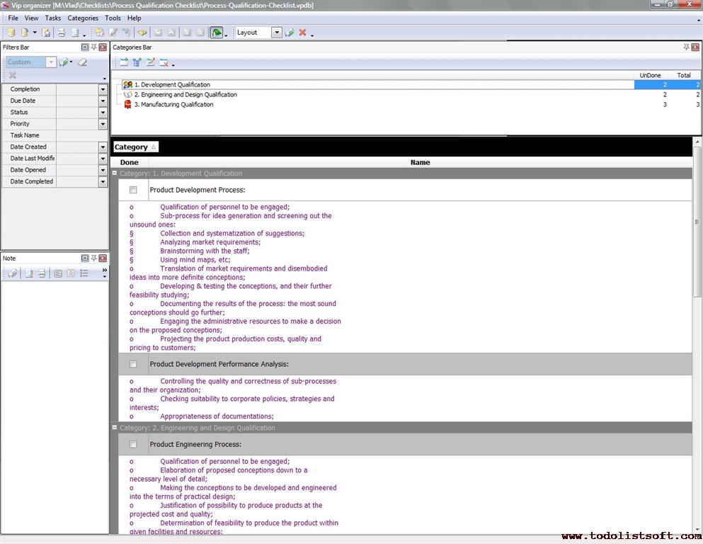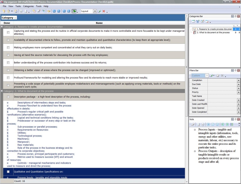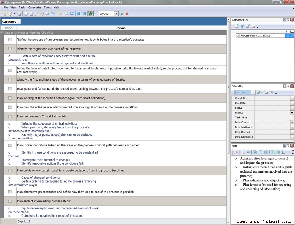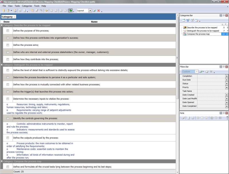 This Process Workflow Checklist describes three steps for performing a typical process workflow. It will be helpful for various specialists involved in process planning and management. The checklist can be uploaded into VIP Organizer which is a task management program. Process Workflow Checklist