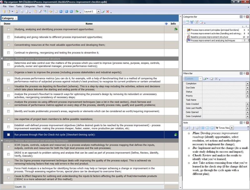 This process improvement checklist will be helpful to any organization or business management in order to learn the process improvement basics, and it can help them to establish effective and continuous business processes streamlining practice ensuring the highest possible performance, quality, lower costs, and better productivity of their businesses. This process improvement checklist explains principles, activities, methods and structure of this procedure.  Process improvement checklist