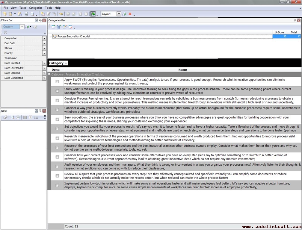Process Innovation Checklist will be helpful to everyone who seeks new ideas for improving his or her business processes through implementing new approaches and methods. With a help of this checklist you will discover a bunch of areas where you can find some fresh opportunities.    Process Innovation Checklist