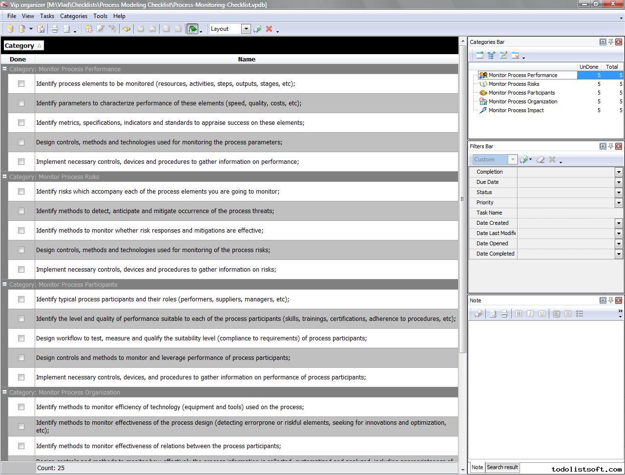 Process Monitoring Checklist is created for business managers who need to keep their processes under accurate control. With a help of this checklist you can prepare an effective schema of process monitoring, including areas of process performance, impact, participants, organization and risks.  Process Monitoring Checklist