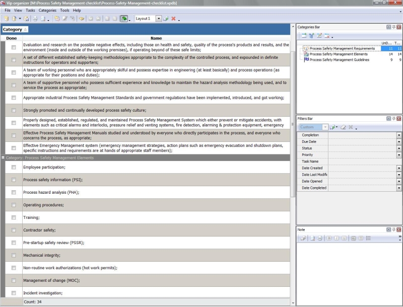 This Process Safety Management checklist can be helpful for enterprise and business managers of different levels as it can help you to give an all-round process safety management definition in your organization to reach a better level of anti-hazard and emergency-prevention policy. This Process Safety Management checklist embraces different aspects of on-the-job safety: safety management basics, standards, elements, etc.   Process Safety Management checklist