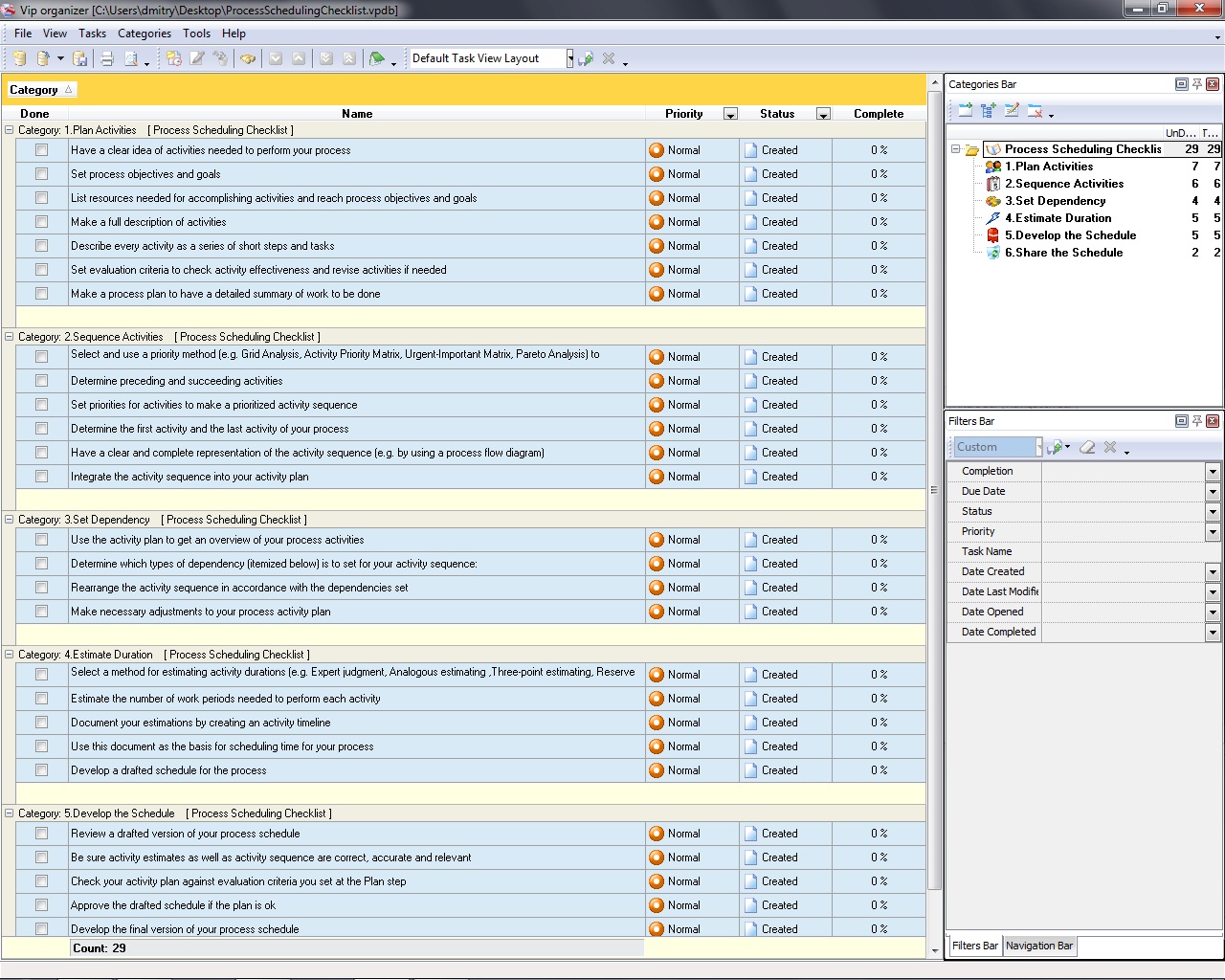 In this Process Scheduling Checklist we describe the procedure of scheduling a typical process as a series of 6 steps. The steps explain how to plan and sequence process activities, set dependencies, determine durations, and make a schedule. The checklist will be helpful for specialists involved in process management.   Process Scheduling Checklist