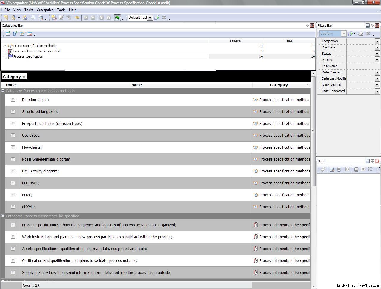 Process Specification Checklist is composed for managers who need to describe processes in order to increase their organizational incorporation and ensure successful functioning. With an aid of this checklist you can specify your processes to make them more manageable. Process Specification Checklist