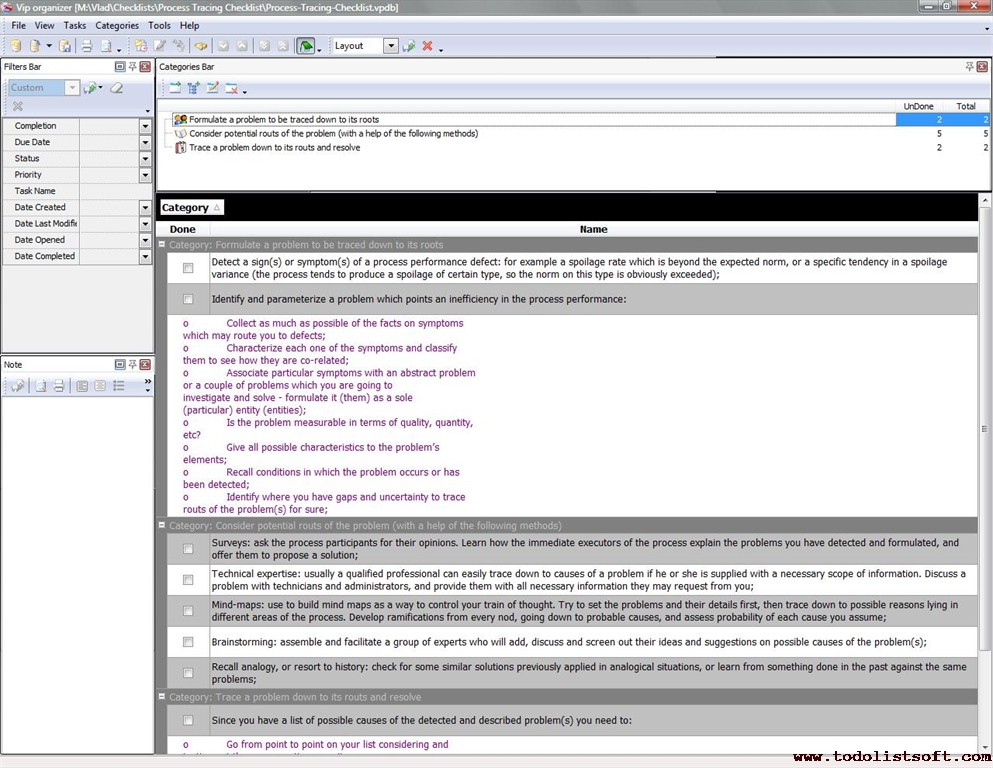 This Process Tracing Checklist is created to support process managers who have detected some problems in performance level of their supervised processes, and therefore need to drill down to find underlying causes of the problem. With a help of this checklist you will know how to formulate a problem, how to consider its roots, and then how to trace it down to resolve.    Process Tracing Checklist