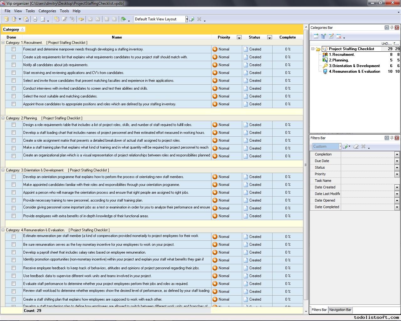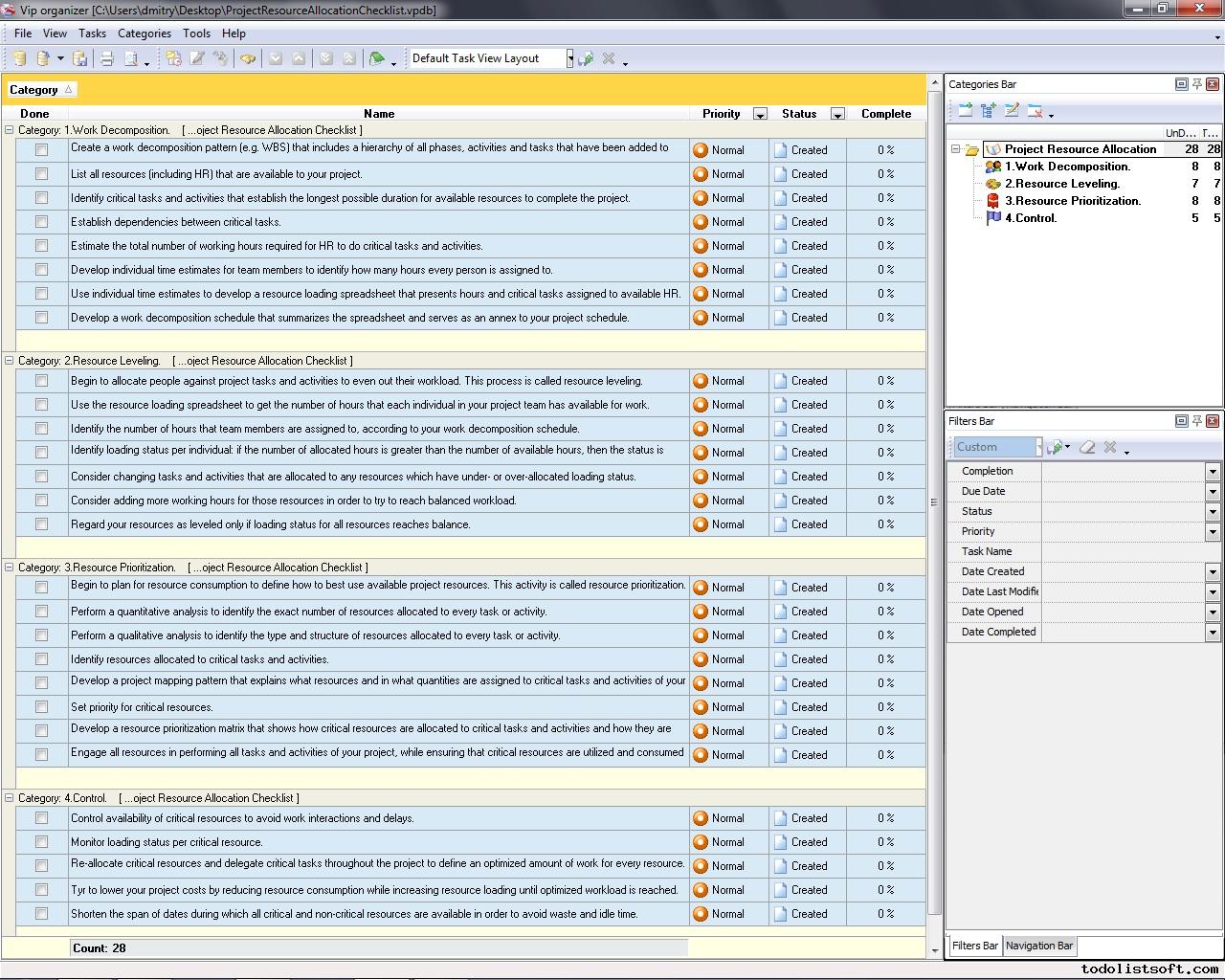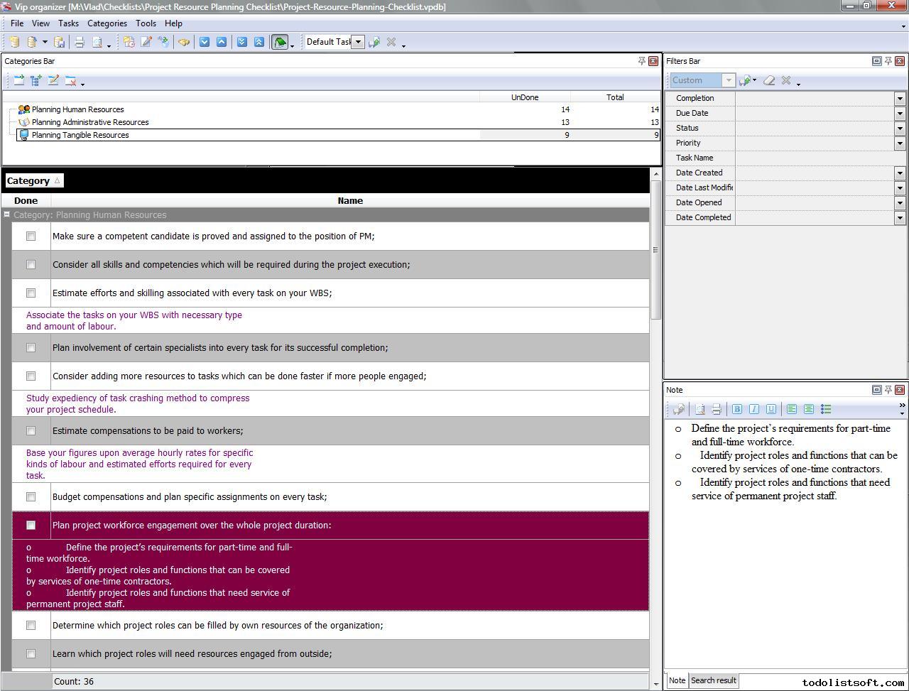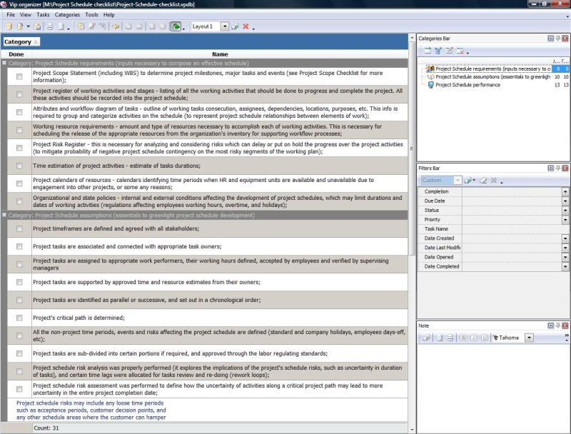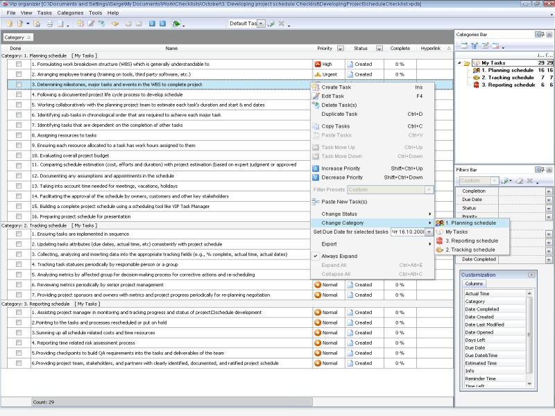 Project scheduling is a process that states how to manage time and resources to accomplish work. Use a scheduling software tool (VIP Task Manager is recommended) and t his developing project schedule checklist to plan and track the schedule of your project. Career Development Checklist