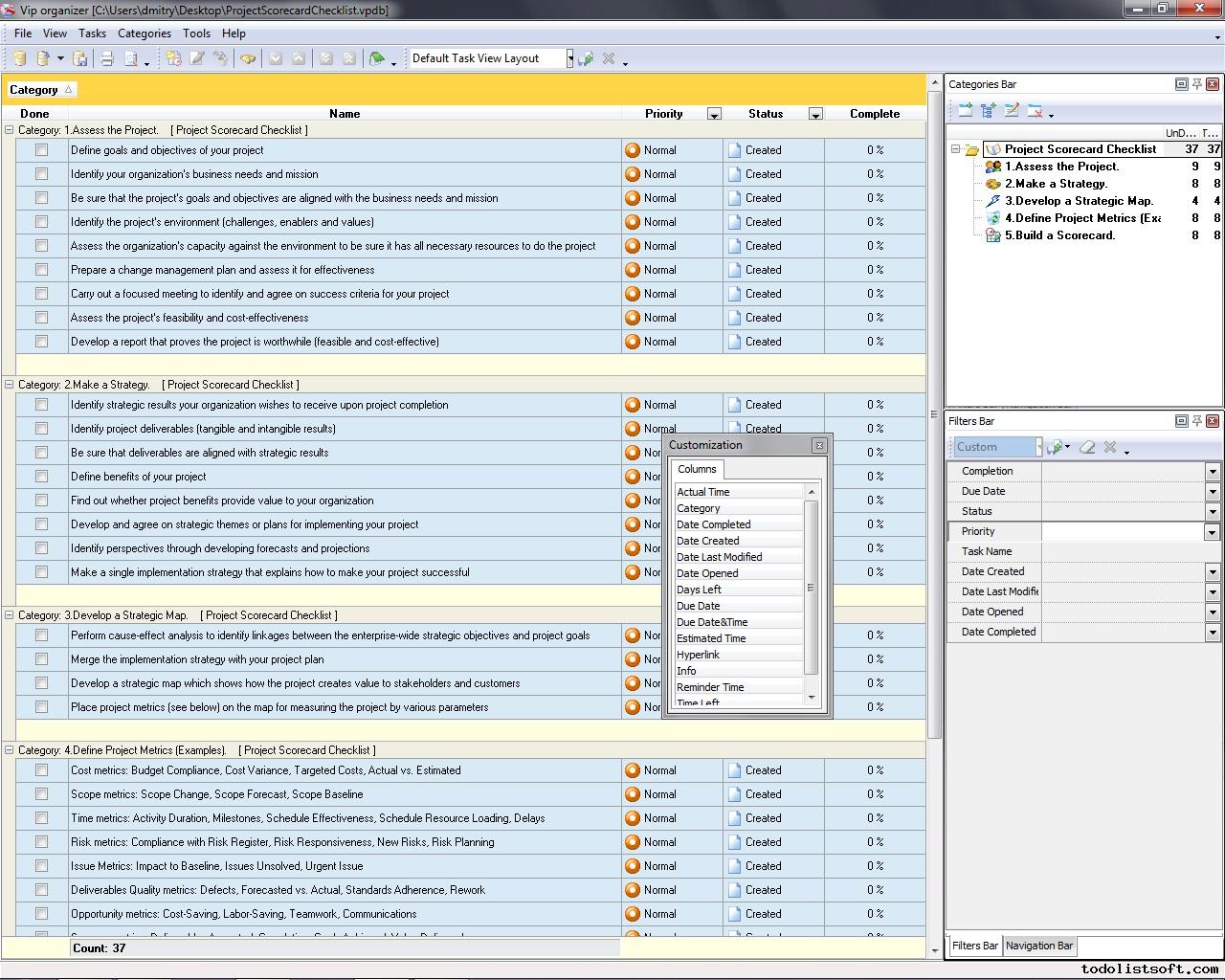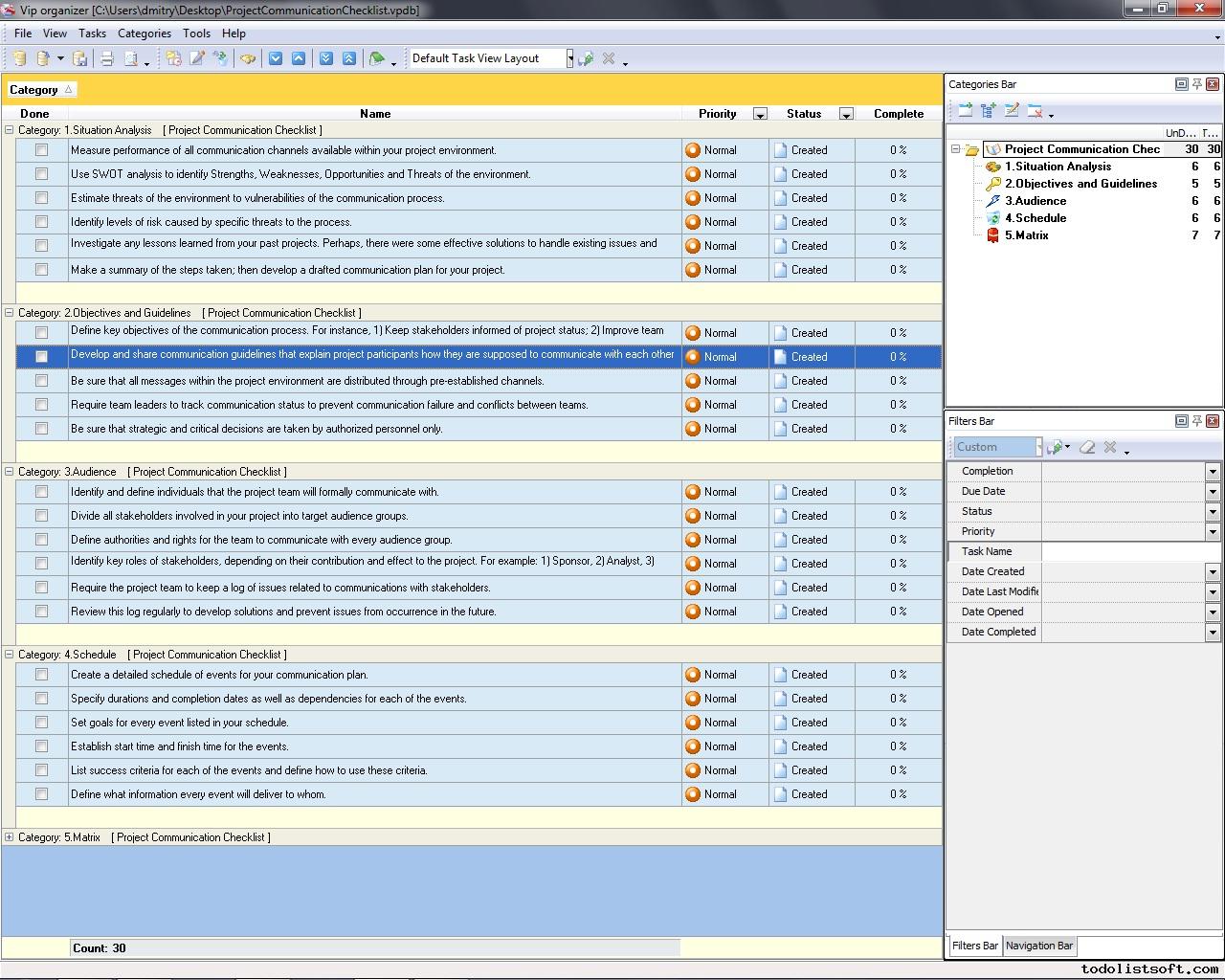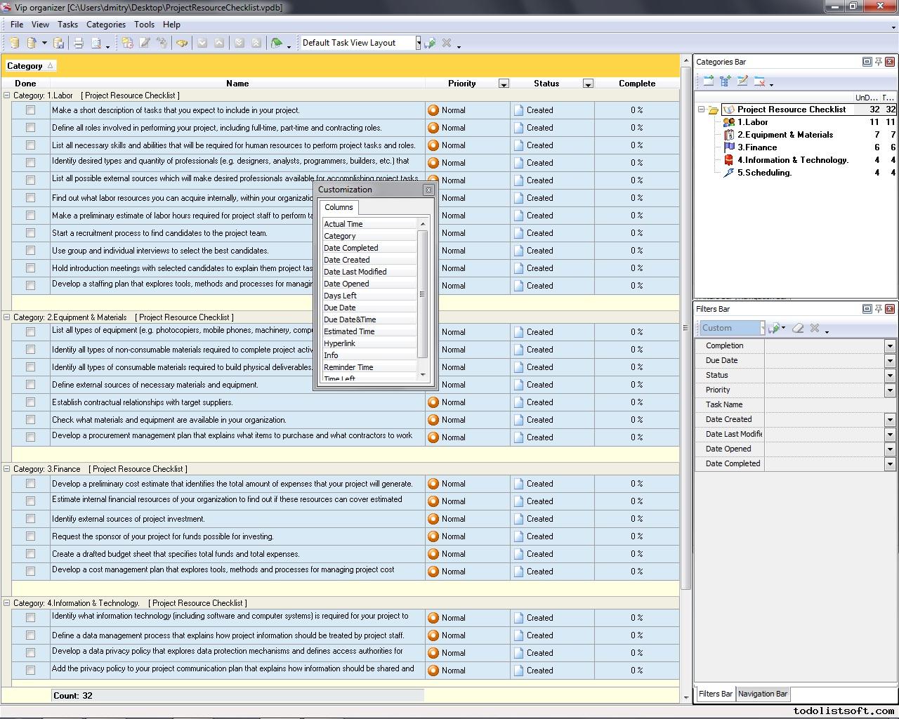 Project scheduling is a process that states how to manage time and resources to accomplish work. Use a scheduling software tool (VIP Task Manager is recommended) and t his developing project schedule checklist to plan and track the schedule of your project. Career Development Checklist