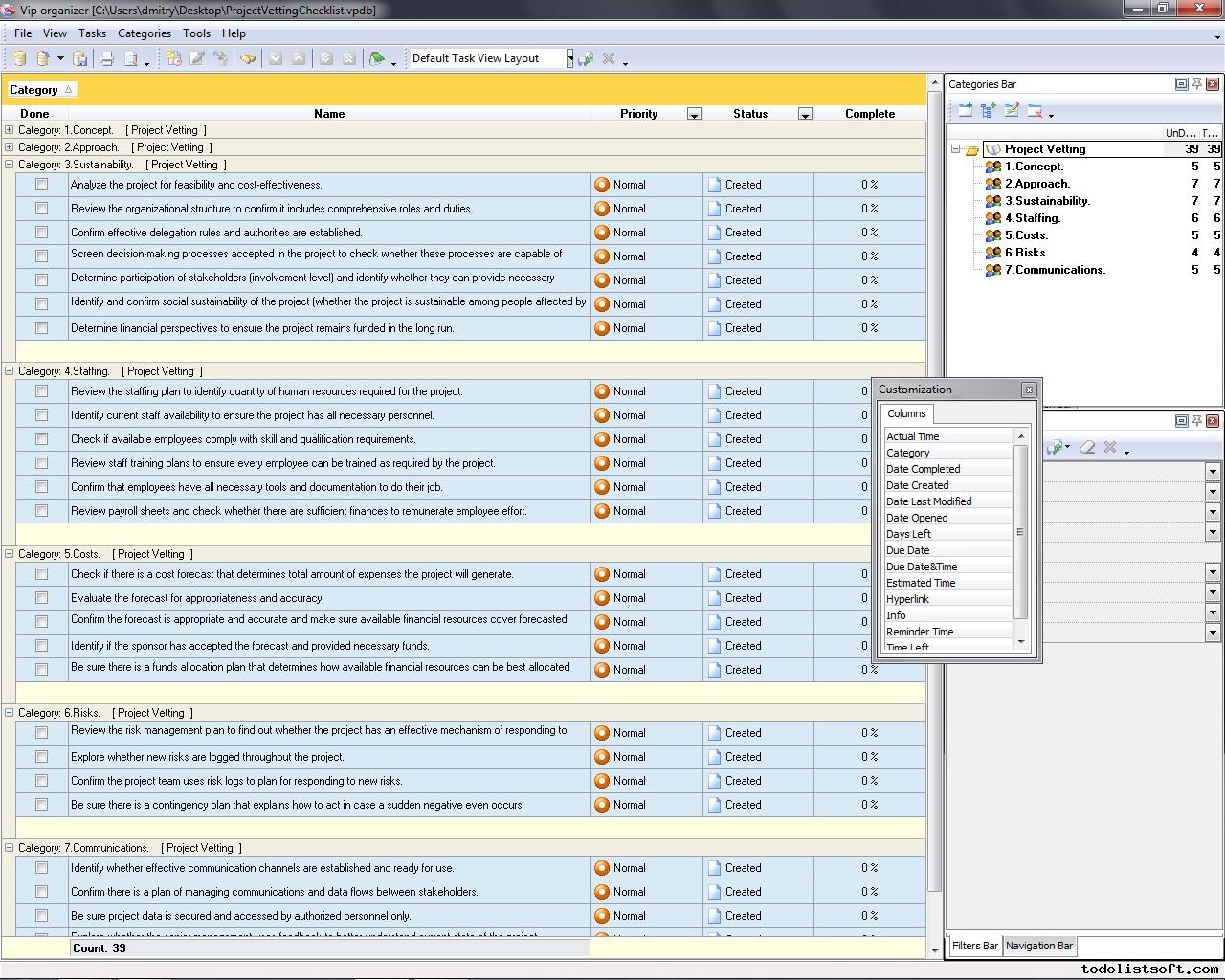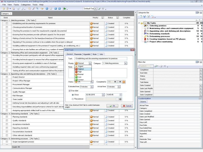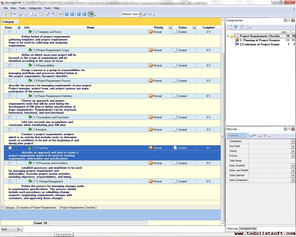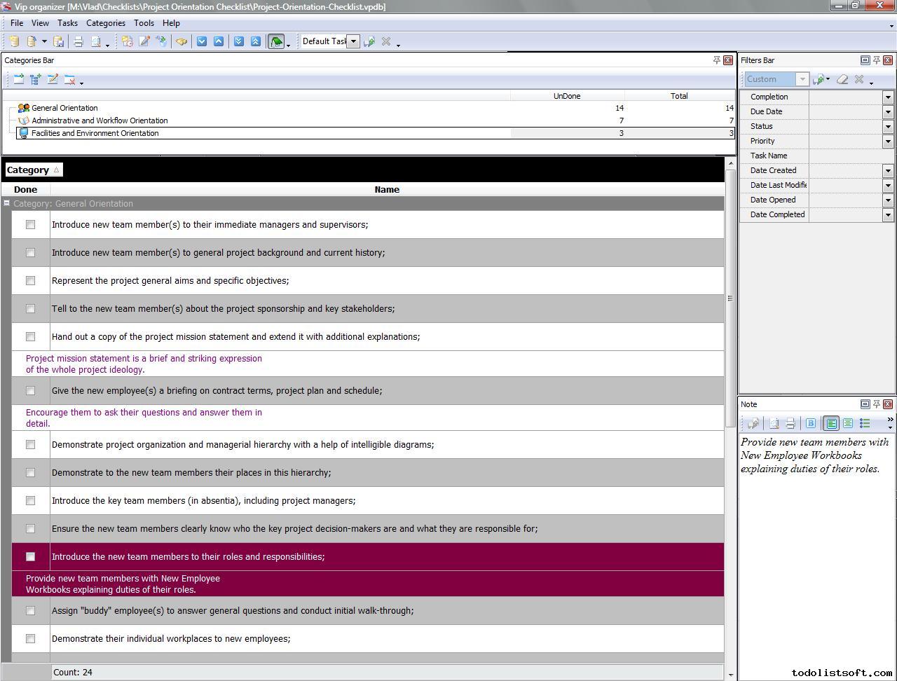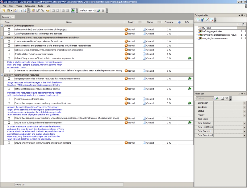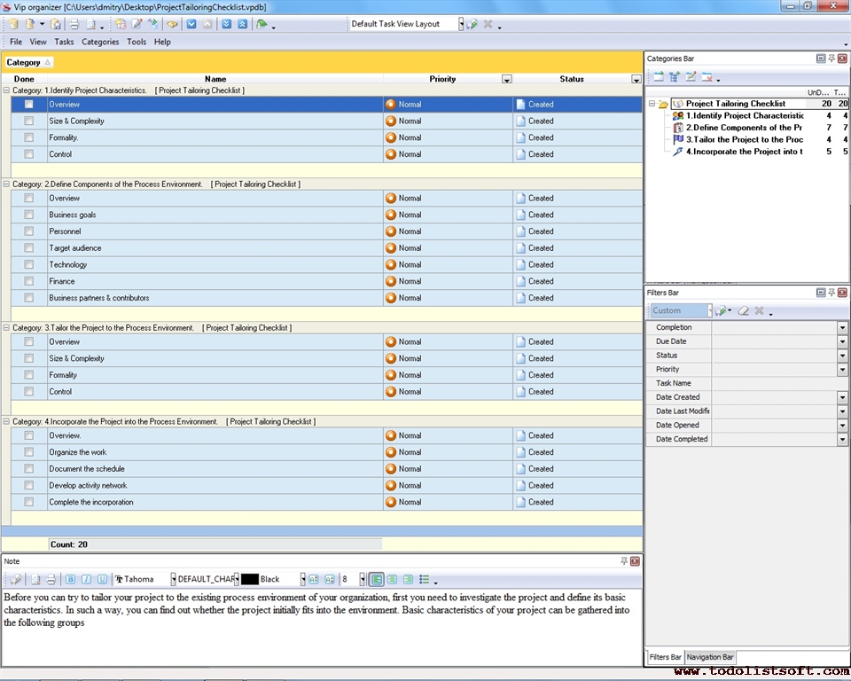Use this Project Tailoring Checklist to tailor and incorporate your project to the business process environment of your organization. The checklist is a step-by-step guide that includes a range of tasks. You can use VIP Organizer software to do the checklist. Project Tailoring Checklist