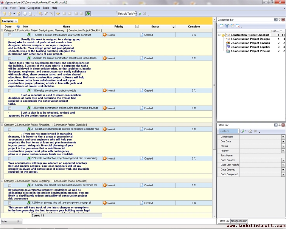 This Construction Project Checklist is designed to help project managers, constructors, architects and engineers to plan, schedule and budget processes for a construction project. You can use this checklist to get an idea of managing typical construction projects. Construction Project Checklist
