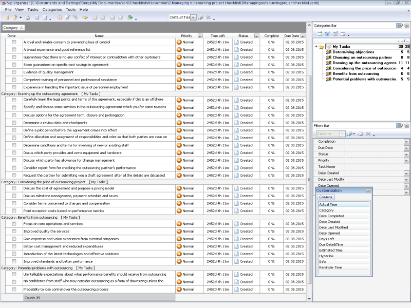 Management of an outsourcing project can be more difficult and complicated process rather than any other sort of project. Project manager should define objectives, select the right outsourcing partner, and make an agreement. The outsourcing project takes more time and requires high competence and broad experience. The Managing outsourcing project checklist will help prepare, start and control the project, and to handle relationships with outsourcing partner. Project Management Template