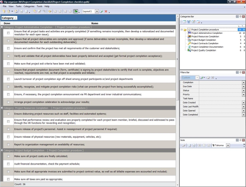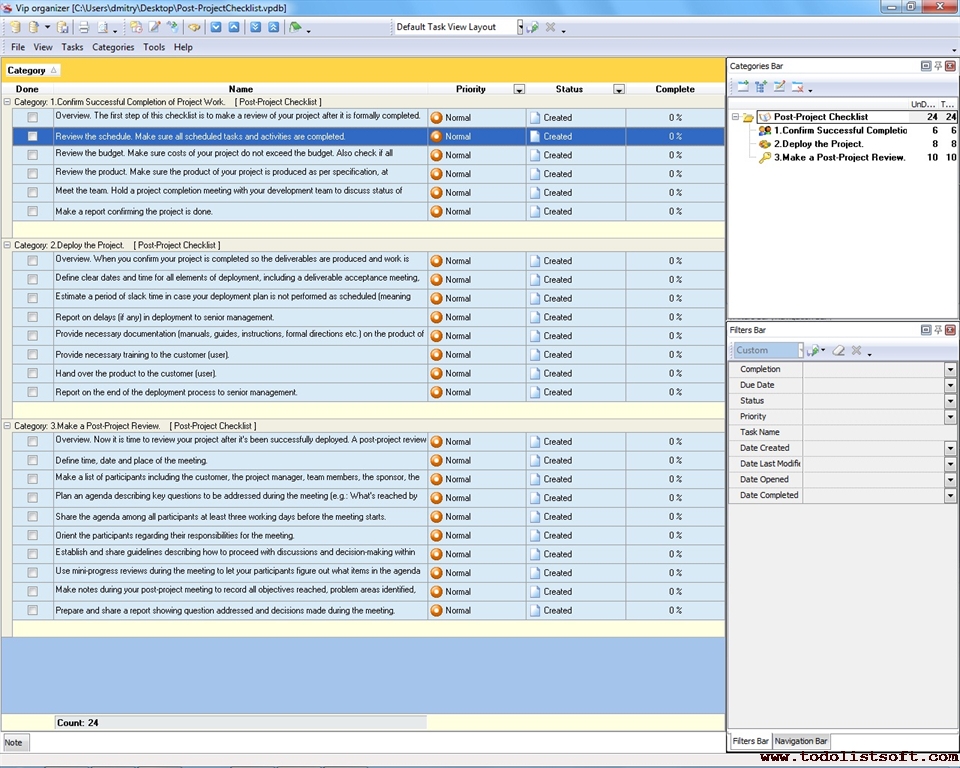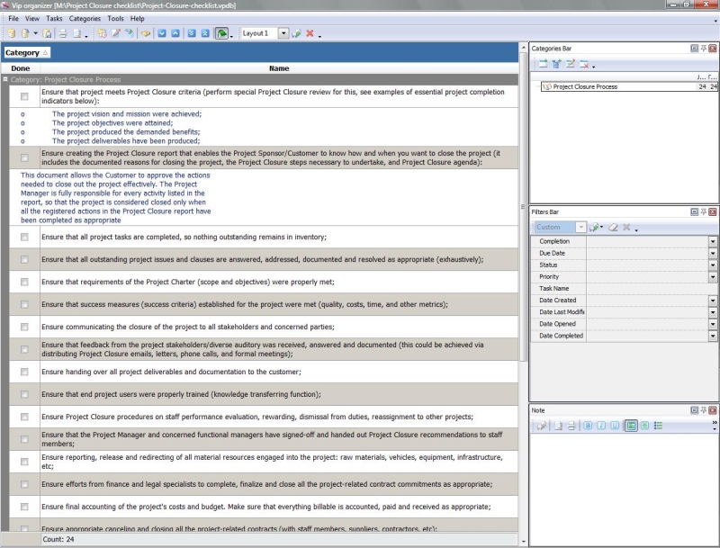 This Post-Project Checklist is designed to help you review your project and hold a post-implementation meeting after the project has been successfully completed and deployed. You can use VIP Organizer software to upload the checklist and use it in your daily practice of project management. Post-Project Checklist