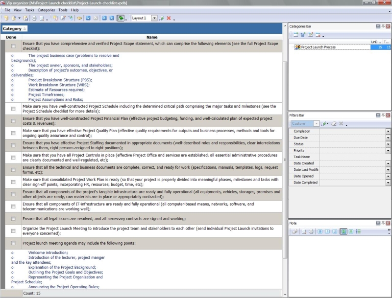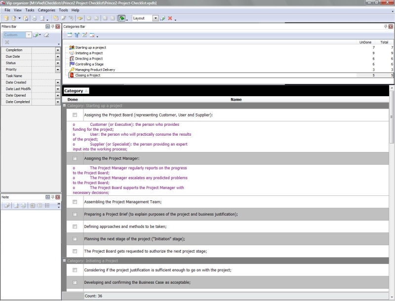 This Prince2 Project Checklist is created to help people in applying this famous methodology used by UK government (as the project management standard for public projects). With a help of this checklist you can learn the main processes and activities included into Prince2.   Prince2 Project Checklist