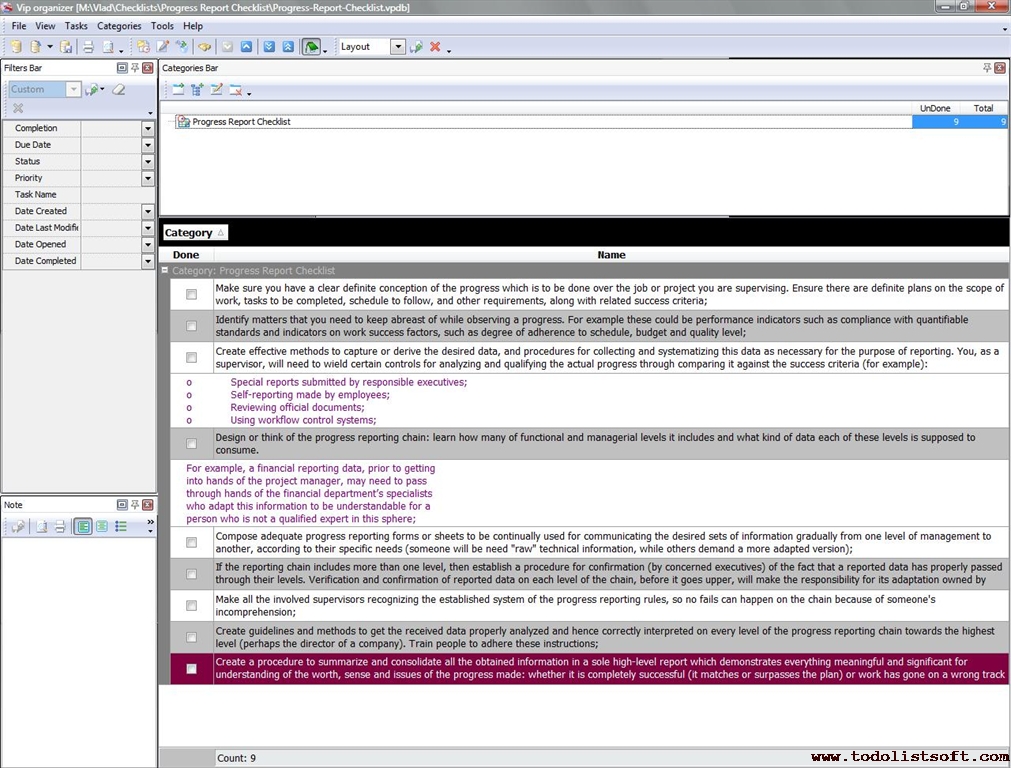 This Progress Report Checklist is composed to help everyone who is in charge to measure and control progress over certain tasks or projects (project managers, task supervisors, etc). With a help of this checklist you will be able to inspect if everything necessary for this function is ready.    Progress Report Checklist