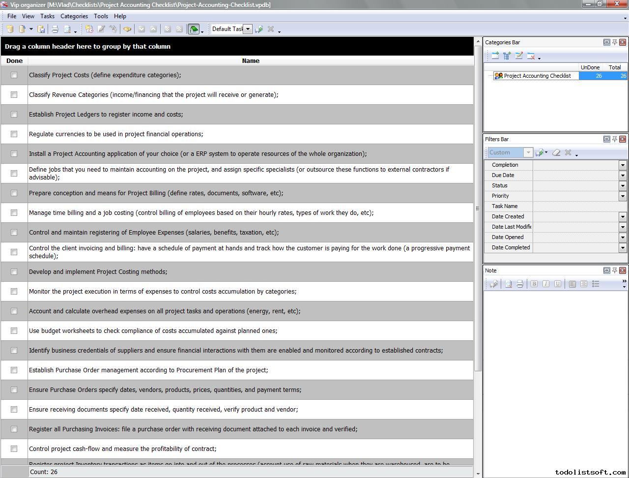 Project Accounting Checklist is created for project management to establish accounting process upon their projects to monitor execution of project budgets. In this checklist you can find a number of activities that you need to perform project accounting which is different from standard corporate accounting. Project Accounting Checklist