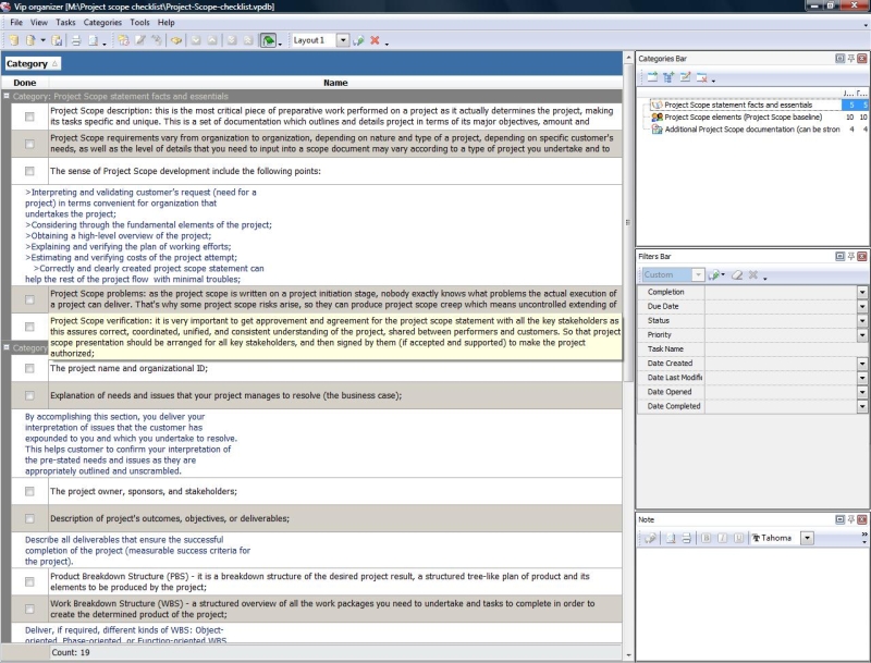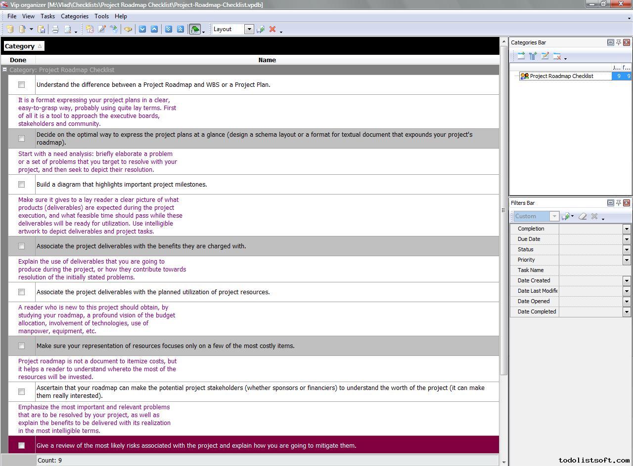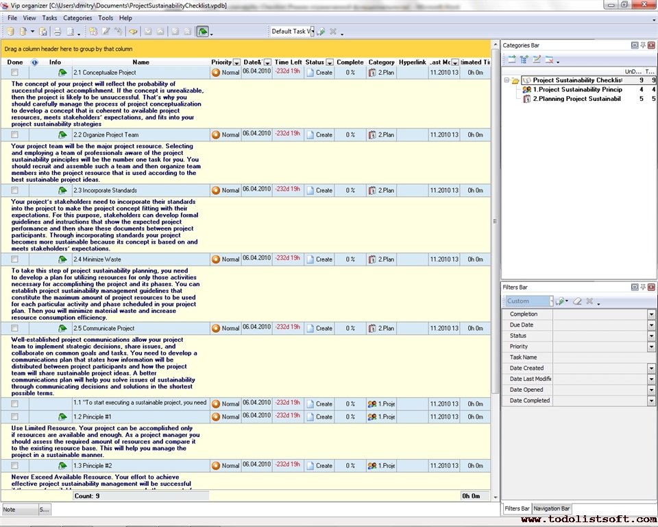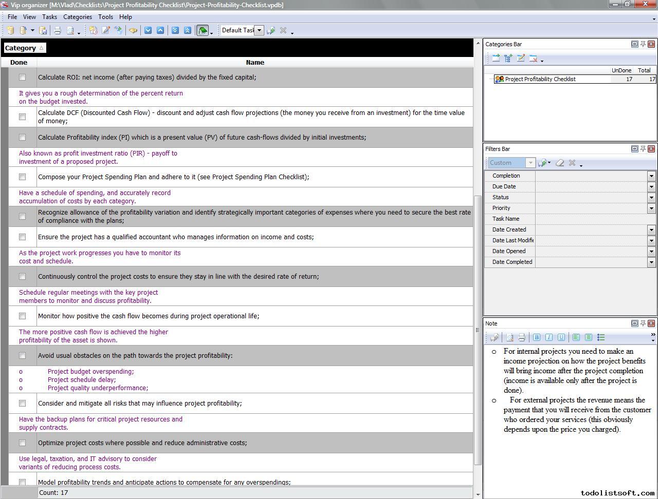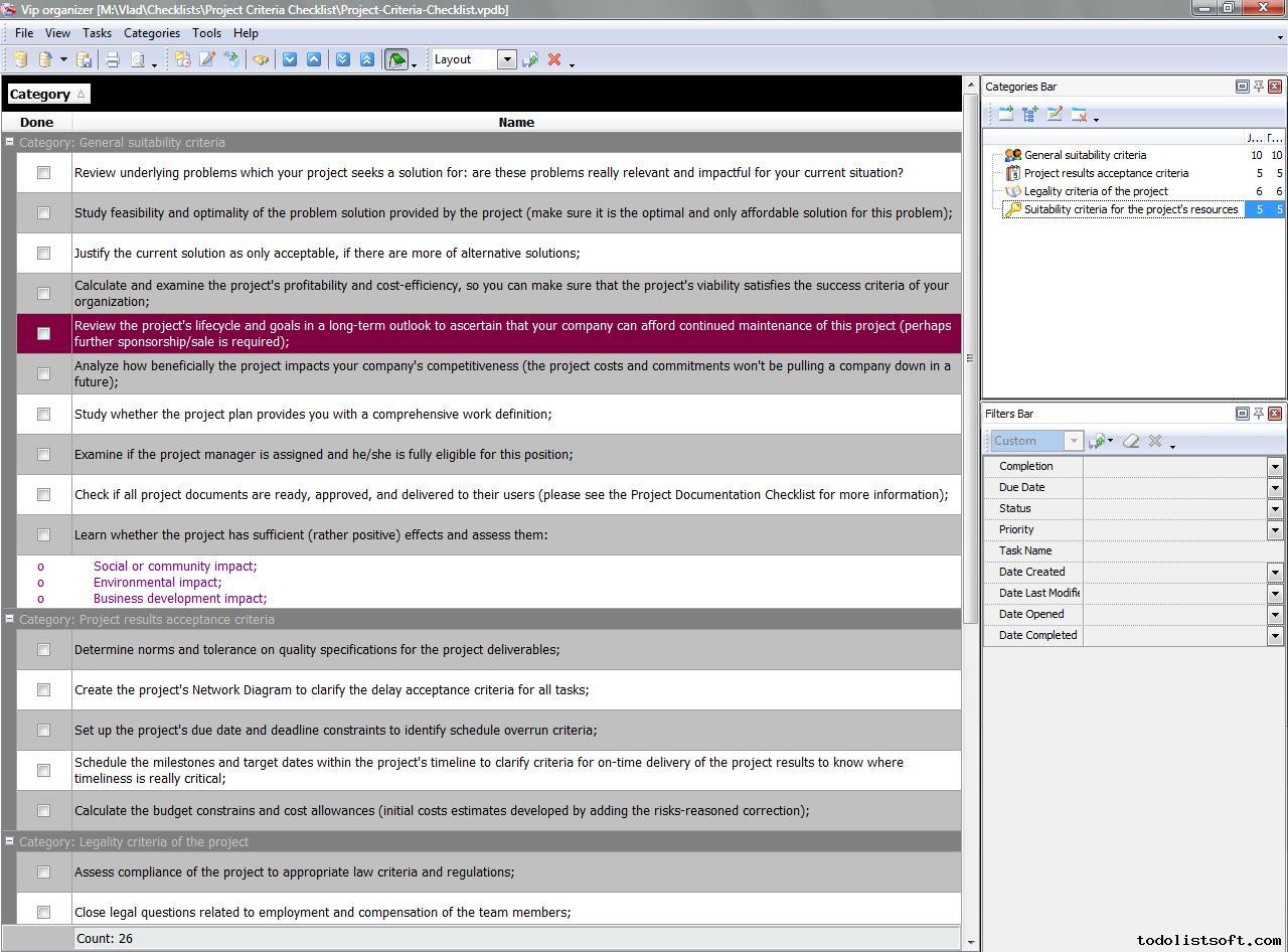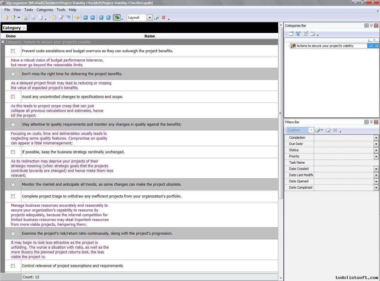 Project Viability Checklist is created for all business and project managers who wish to learn the principles to prevent their projects from losing their maximal benefits. With a help of this checklist you can correct and examine your managerial actions to know whether they secure or contradict the viability of your projects. Project Viability Checklist