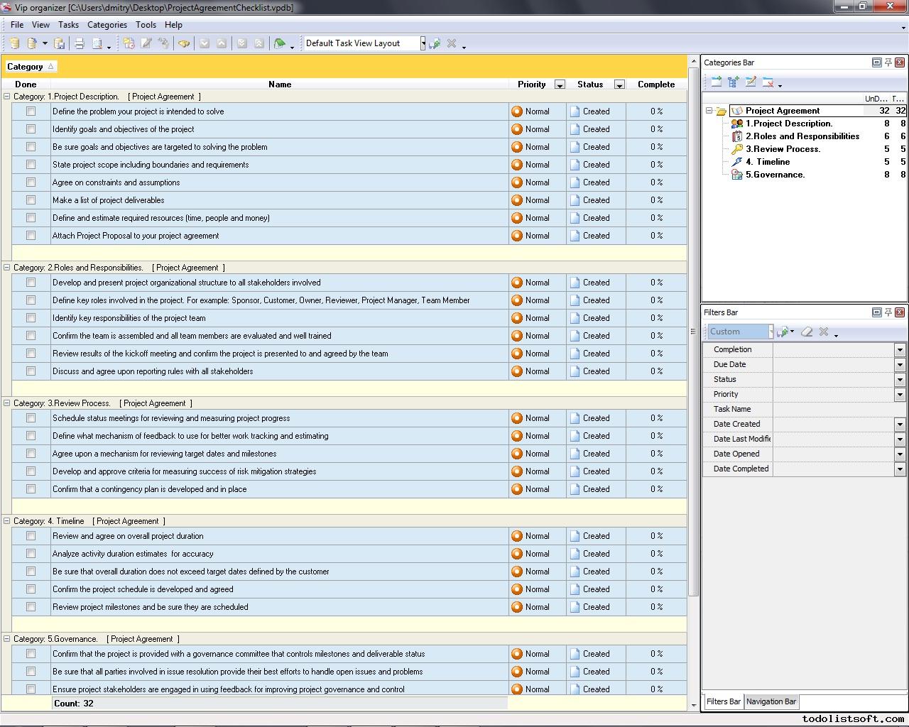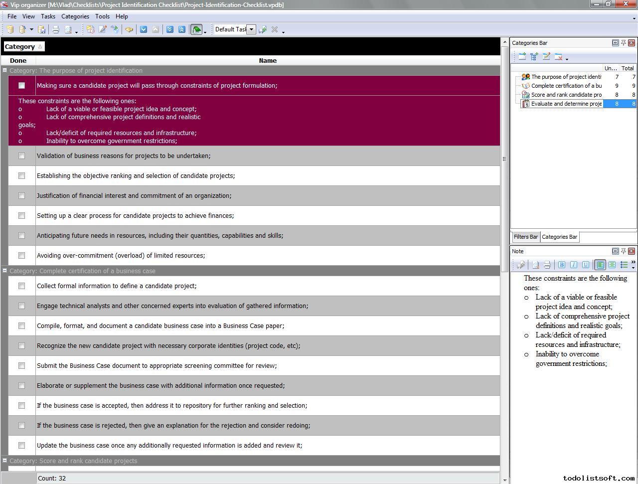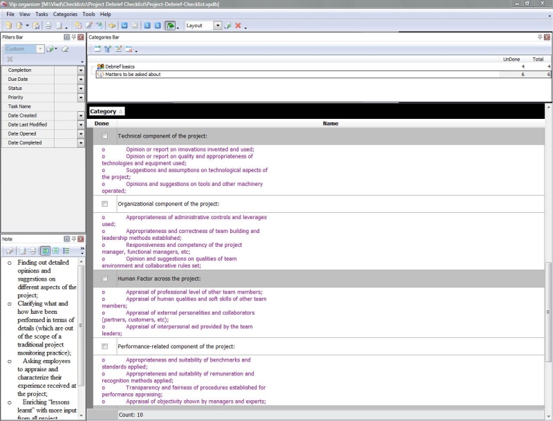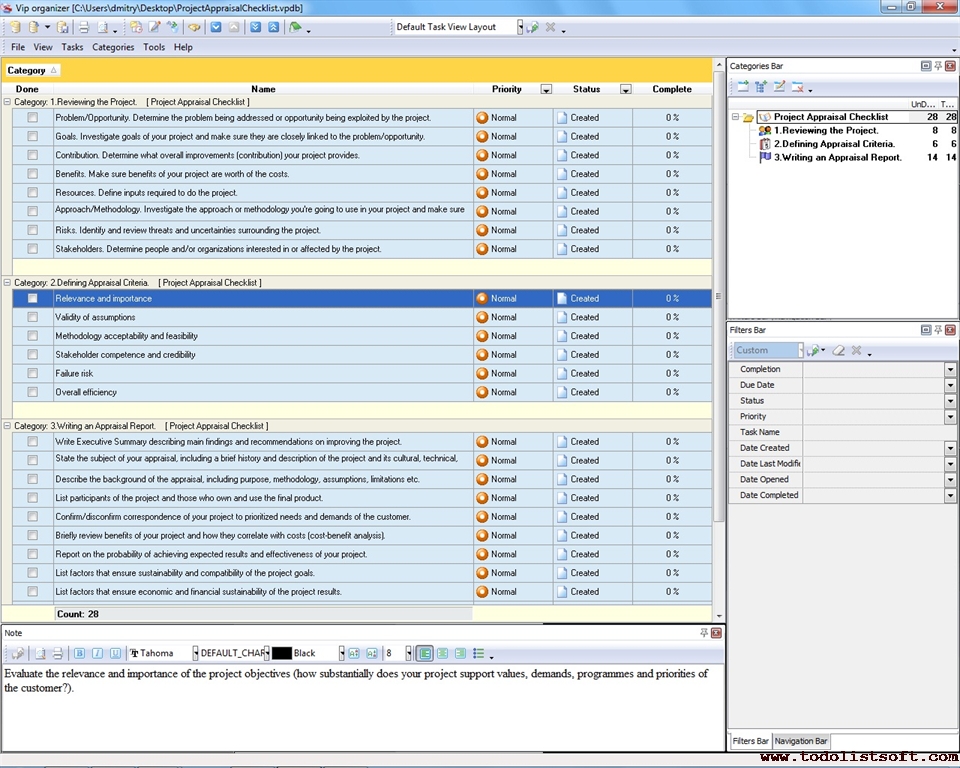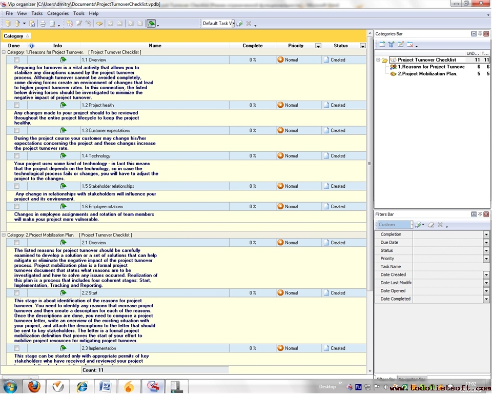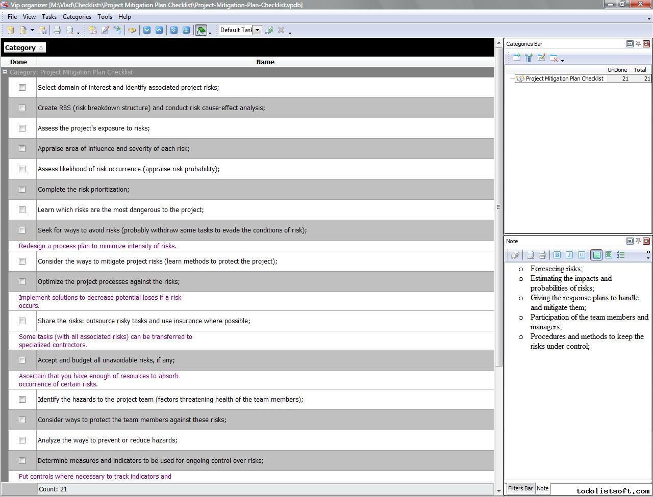 Project Viability Checklist is created for all business and project managers who wish to learn the principles to prevent their projects from losing their maximal benefits. With a help of this checklist you can correct and examine your managerial actions to know whether they secure or contradict the viability of your projects. Project Viability Checklist