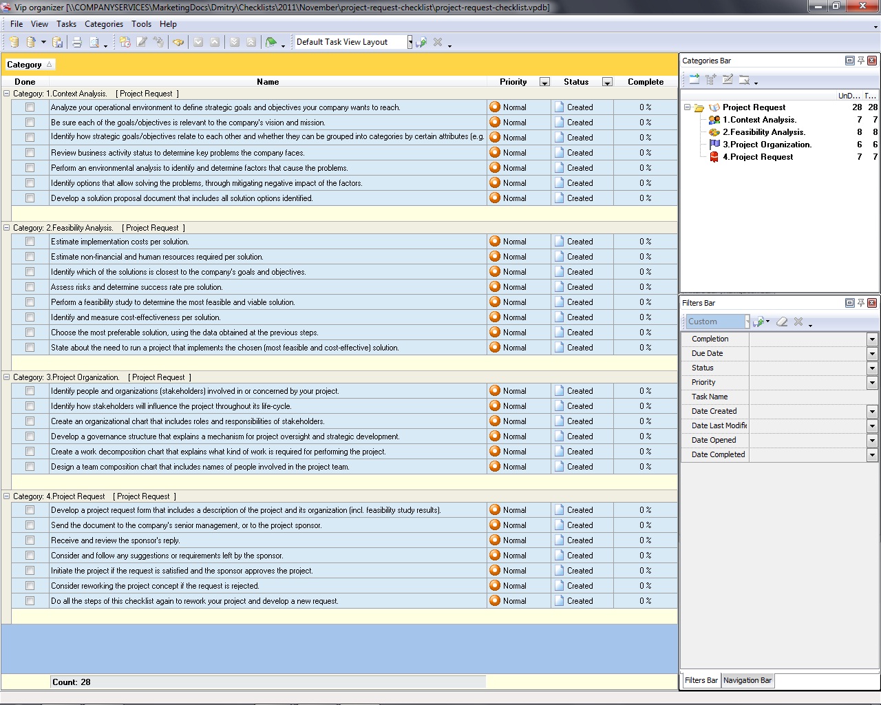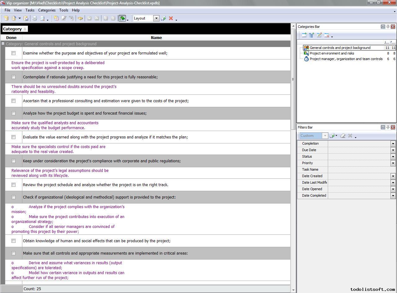 Project Analysis Checklist is created to help the project managers in conducting all-round analysis of their projects before they are started and while they are on the run. In this checklist you will find information on how to analyze project’s background, environment, organization and other things. Project Analysis Checklist