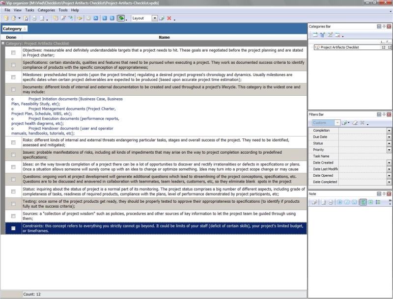 This Project Artifacts Checklist is a collection of matters which any project is based upon. If all the matters listed in this checklist are properly respected on your project, then you have laid a strong fundament for project’s success. Project Artifacts Checklist
