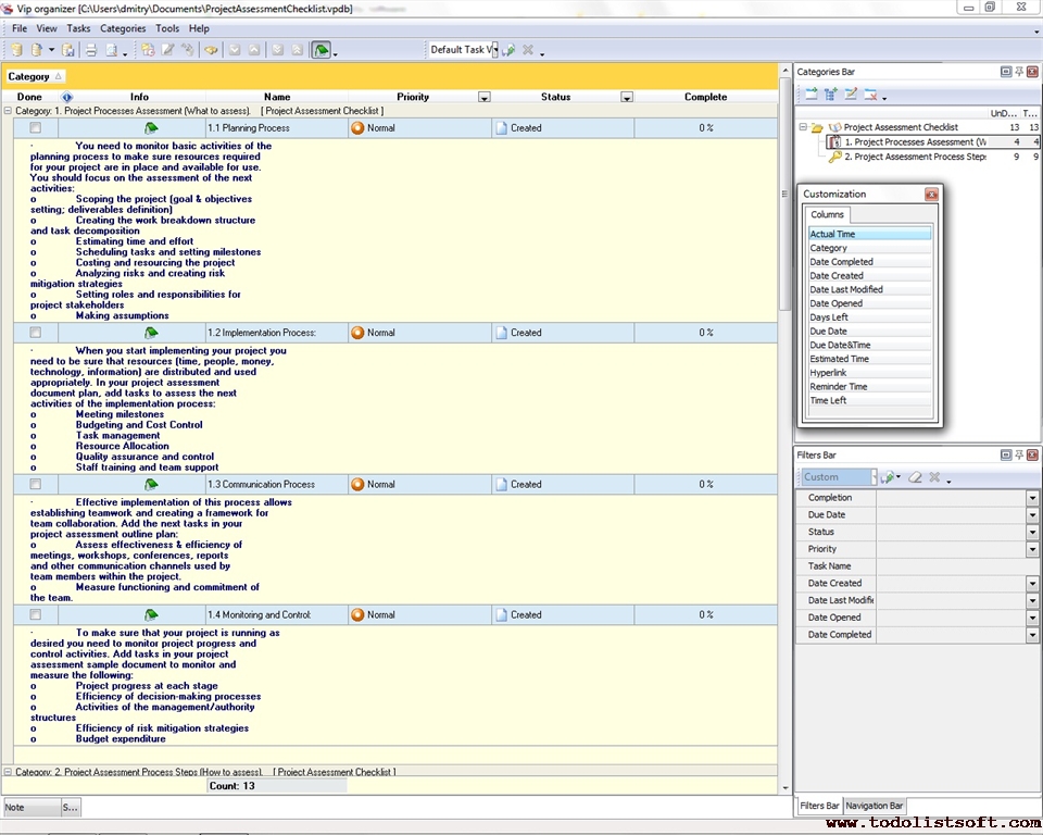 The next Project Assessment Checklist helps you monitor and control your project through assessing its basic processes and measuring performance and efficiency at each project stage. You can use the checklist throughout the entire lifecycle of your project to make sure that the project shows expected performance and keeps to the baseline. Project Assessment Checklist