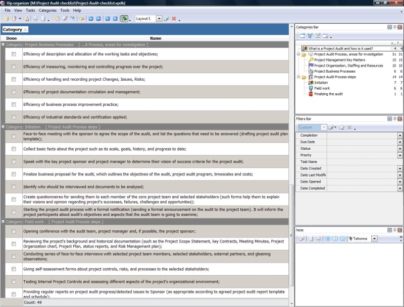 This Project Audit checklist will be helpful to those who would like to learn the purpose of this process and how the body of Project Audit life cycle is organized. This Project Audit checklist will explain what it is, how it is used, what activities it includes and what outcomes a project audit is supposed to deliver in a result Project Audit checklist